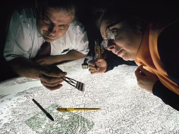 照片在肯尼亚拍摄,古生物学家玛丽-利基和路易斯-利基夫妇正在分析化石。利基夫妇一直致力于寻找早期人类证据,他们的儿子和儿媳——理查德-利基和莫维-利基以及他们的孙女路易丝-利基也投身于这一研究领域。从1960年开始,利基夫妇共获得国家地理学会提供的76笔资金。弗朗西斯说:“我们长久以来一直向利基家族提供资金,资助他们进行研究。他们的研究发现是一份宝贵的遗产,加深了我们对人类起源的了解。”