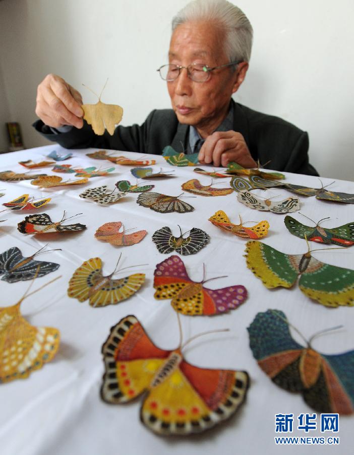 11月10日,顾厚新老人展示其创作的“银杏叶蝴蝶”。江苏苏州市解放社区81岁老人顾厚新将一片片银杏叶绘制成五彩缤纷的“花蝴蝶”。目前,老人已创作完成700多只“银杏叶蝴蝶”。