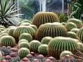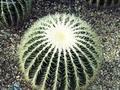 金琥(Echinmactus grusonii)金唬属,为仙人球类体形最大的l种,径可达8Ocm,球全深绿,棱约20条,沟宽而深,棱较窄,刺窝大,密生金黄色绵毛,7~9枚金黄色硬刺呈放射状分布 于刺窝申。花着生于茎顶,长4~6cm,内瓣亮黄色。繁殖靠播种和嫁接仔球。