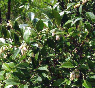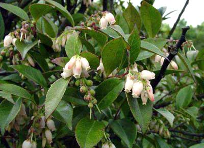 常绿灌木,高达1.5米,分枝多;幼枝有灰褐色细柔毛。叶革质,椭圆状卵形、狭椭圆形或卵形,长2.5—6厘米宽1—2.5厘米,顶端急尖,基部宽楔形,边缘有尖硬细齿,上面有光泽,中脉两面多少疏生短毛,网脉下面明显;叶柄长2—4毫米。总状花序腋生,长2—6厘米,有微柔毛;苞片大,宿存,长5—10毫米,边缘有疏细毛;花梗短;花萼5浅裂,裂片三角形,有细柔毛;花冠白色,通常下垂,筒状卵形,长5—7毫米,5浅裂,有细柔毛,雄蕊10,花药无芒;子房下位。浆果球形,直径4—6毫米,幼时有细柔毛,熟时紫黑色,稍被****,味甜,可生食。