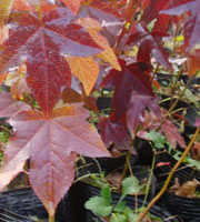 叶上有5-7个深裂。每个裂片边缘都有细锯齿。夏季叶片红、黄、紫多色混合,红叶期长,秋季颜色由桔黄、红色和紫色。在温暖潮湿地区不落叶,种植区域: 5区至9区,生长迅速,浙江地区一年生小苗可长到30---70CM