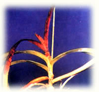 症状:新生叶易发病。初在新叶的叶尖及叶缘处生水浸状小斑点,接着扩大,病、健交界处呈水浸状紫褐色斑,并腐烂。以后被害部干枯。