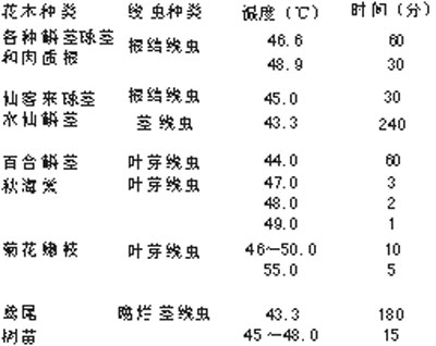 苗木、扦插枝和球茎等无性繁殖材料用热水、药液或两者结合浸,在大量处理前应先要试验,确定对花木生长无害,又能杀死线虫的热水温度、药液浓度和处理时间。不同花木线虫热水浸温度和时间(见表1)。