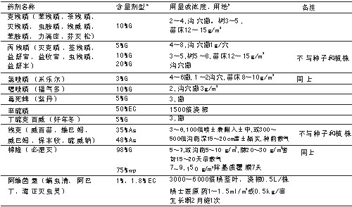 防治线虫的药剂大多用于土壤处理,少量种子苗木处理和生长季喷茎叶。这类药剂的毒性较高,必须确保人畜安全。杀线虫剂主要种类和用量用法(见表2)。