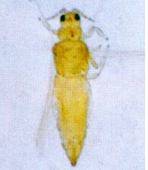 形态特征 成虫体长0.8mm,纺锤形,浅黄色。头前部和触角灰黄色至浅黄色,头部宽,两复眼从头两侧突出。复眼暗红色,2对翅狭长且透明,四周具缨毛,前胸短于头,前胸基部略粗且隆起,有l条翅脉。卵长0.02mm,肾形,无色透明。初孵若虫长约0.22nm,无色或近无色,二龄若虫浅绿色,三龄黄绿色,四龄体长0.8mm,桔红色,若虫均无翅,与成虫相似。