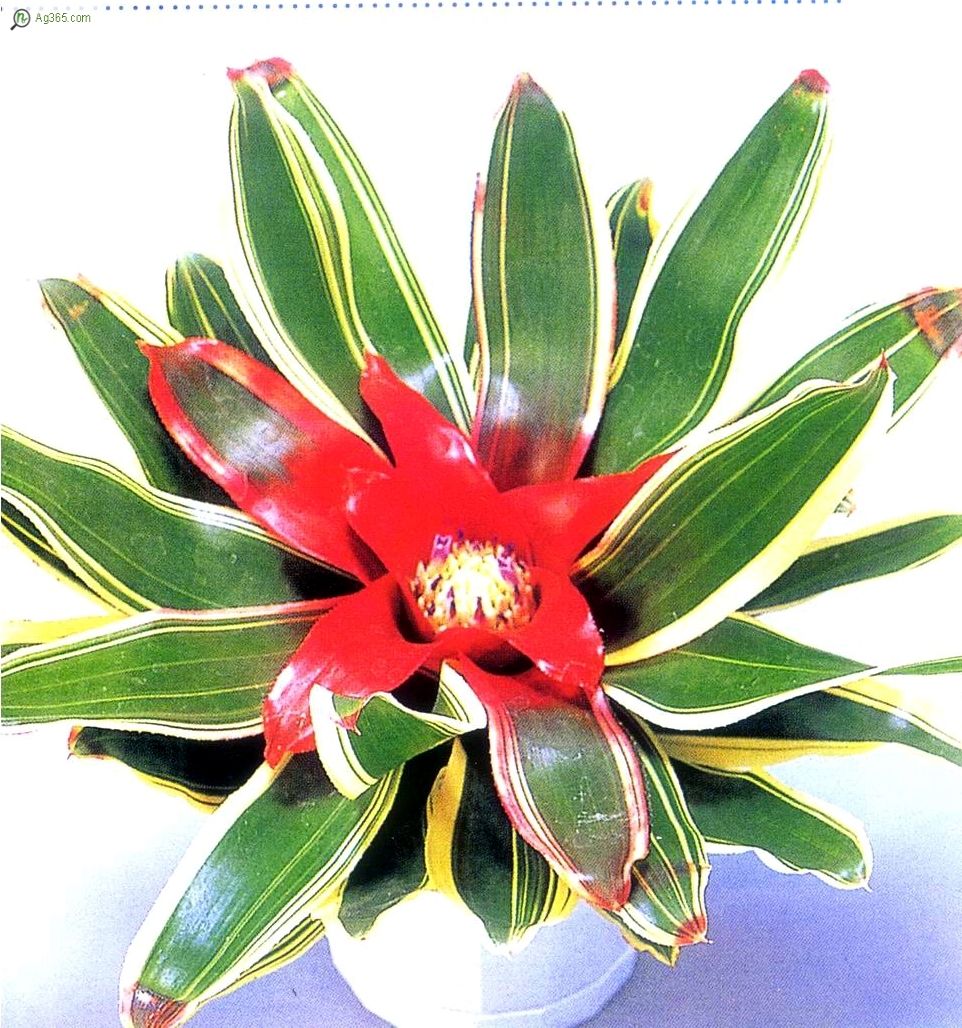 红杯凤梨(N.farinosa),叶呈莲座状排列,基部叶片为深绿色,花时短的内层叶片变成鲜红色。小花紫色。
