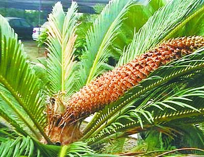 近日,朝阳区绿化局大黄庄苗圃花木基地内铁树雌雄株同时开花。民间俗传“铁树60年开一次花”,甚至形容“铁树千年开花”,据园林专家介绍,铁树又名苏铁,常绿棕榈状木本植物,分雌株、雄株,喜暖热湿润气候,在南方种植十余年以上的铁树有可能每年开花,花期不固定,北方气候干燥寒冷,雌雄同时开花,堪称奇异。铁树雄株花球呈圆柱形,雌株花球呈扁球形,在气候、肥料充足的情况下,能促成雌雄株同时开花。