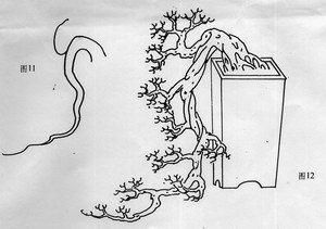 3、采用下倾,欲上先下,先抑后扬,不仅顺应了悬崖主于走势的特征,而且从统一中求变化,并且力求与其他枝托拉开距离。有己面目,否则,便无顶托重点、顶托优势、顶托作用。因而顶托的走向取势应留意到三环节:首先是"顺",明知顶托应扬起,但却有意识将第一节顺应大局下倾,此即欲上先下,先抑后扬。其次为"扬",即顶托主脉第二节或第三节始回旋曲转而后上扬,意在仰首穹苍。其三为"展"。主脉上孤,次脉边枝扩张,长短错落,疏密有致,顾盼呼应,使顶托在求得自身变化的同时,又能溶入整体和谐之中,使整体造型得势、美观、更具艺术价值。(图11、12)