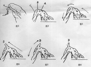 2、B点定托,即定托选位设在主干斜立段与下跌之间曲转处正中。此可能摆脱上述之嫌,但从枝的审美取势看,存在枝势走向问题,枝托第一节若直立,与主干成90度,显得生硬突兀不自然(图4),若右行则与主干及其他枝托不协调(图5),若左行又与主干斜立段相平行(直线),欠错落,有碍美观(图6),所以应酌酿而定。