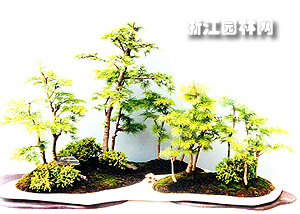 金钱松盆景最为常见的形式是将数株合栽制作丛林式盆景,也可2株合栽或单株孤植,制成双干式或直干式、曲干式、斜干式等不同形式的盆景。通常采用粗扎细剪的造型方法,直干式等孤植的盆景造型可在春季萌芽前用金属丝或棕丝对树干进行蟠扎,树冠也可蟠扎成片状,由于其生长迅速,成型后应及时拆除,以免造成“陷丝”。合栽的丛林式盆景适宜用长方形或椭圆形紫砂盆、陶釉盆、石盆等,花盆宜浅不宜深。树干一般不作处理,以保持其固有的直立形态,侧枝可适当蟠扎,并修剪出起伏而流畅的枝脉,修剪时应考虑株与株、枝与枝之间的位置、层次、方向、虚实、长短关系,合栽的株数越少,留枝越密。栽种时应选择大小、粗细既富于变化,又不过于悬殊的苗木,并注意主次、高低、疏密的变化。最后再根据植株的形态、盆面的空间等情况,选择大小、形态合适的石头进行点缀。
