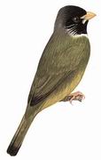 描述:体大(23厘米)的偏绿色鹎。厚重的嘴象牙色,具短羽冠。似凤头雀嘴鹎但冠羽较短,头及喉偏黑,颈背灰色。特征为喉白,嘴基周围近白,脸颊具白色细纹,尾绿而尾端黑。