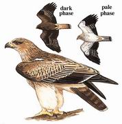 描述:体型略小(50厘米),胸棕色(深色型)或淡皮黄色(浅色型),无冠羽,腿被羽。上体褐色具黑色和皮黄色杂斑,两翼及尾褐色深。飞行时深色的初级飞羽与皮黄色(浅色型)或棕色(深色型)的翼下覆羽成强烈对比。尾下色浅。