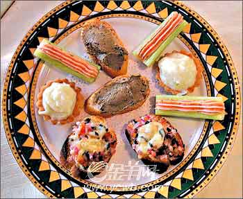 巴黎小吃成就了我此行的意外之喜。一盘里装着四款小点心,看起来都是特别简单的,一个就像是抹了点鹅肝酱在面包圈上,另一个是在大段的芹菜上擦了一条腌三文鱼酱,还有一种就是著名的Bruschetta。Kien说巴黎的小吃是千变万化的,就有点像玩组合游戏一般,客人来了,打开冰箱看看,有什么就拿什么出来稍稍加工一下,简单而有心思。从这一点上来说,巴黎小吃实际上最能体现法国人的浪漫情调,讲究个人的发挥和心情的支配作用。Kien的Br鄄uschetta搭配得尤其出色,口感软脆相宜。后来又试过他做的一种法式三文治,两条烤得香脆脆的面包夹着新鲜蔬菜和火腿,再抹上点鹅肝酱,材料与这个Bruschetta差不多,但感觉上又是另一番情趣。