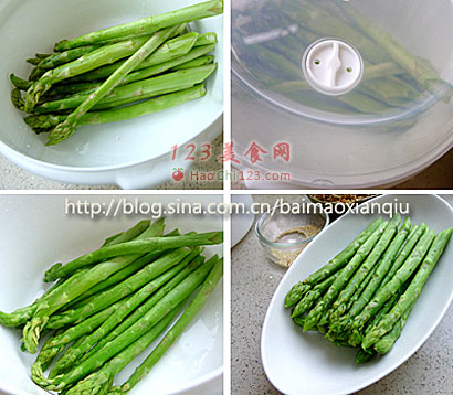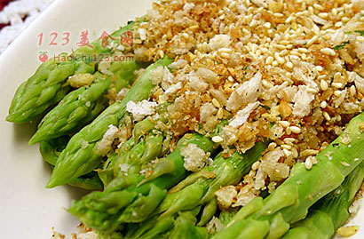 4、将用微波炉蒸熟的芦笋(也可弄成小段后)码入盘中,盖上调味面包酥,撒上些香熟的白芝麻,拌食。