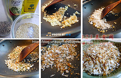 3、与此同时,炒锅放入橄榄油,油7成热的时候依次蒜粒,煸炒出香后加入面包屑,转小火不断翻炒,至其颜色焦黄,然后加入适量的盐和黑胡椒粉,混香焙炒,最后撒上适量的香芹碎,拌匀后即可盛出。