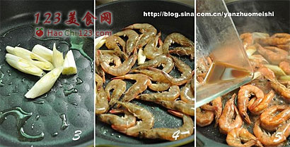 2、锅中入橄榄油,放入大葱段,炒出葱香味,倒入虾煎炒。用筷子翻炒虾至全变红色时倒入腌虾的汁水。