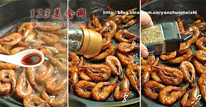 3、倒入剩下的红酒,小火焗虾,让料汁煮入味。汤汁即将收干时,撒入现磨黑胡椒粉、香草碎翻匀即可关火,摘除大葱段,盛入盘中,撒上椰蓉即可。