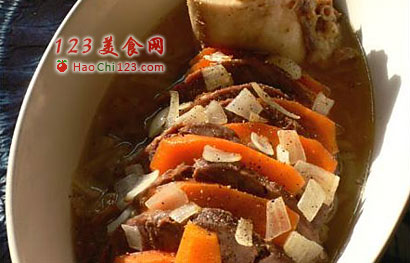 3、调味:平锅放油,下洋葱碎煸香,容器加热,将牛骨块和热好的牛肉片以及煮好的胡萝卜片顺序码放,同时用小锅煮沸加了盐的牛肉汤,过滤的,趁热淋在码好的材料上,倒入煸好的洋葱碎,再撒上适量的盐和黑胡椒粉,热食。原版菜使用欧式韭葱和辣根调味。