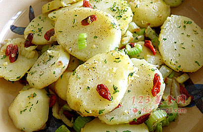4、待土豆变色出香,加入枸杞子,撒上欧芹碎,加入适量的盐和黑胡椒粉调味,大火混味均匀,轻手盛盘,即可食用了。