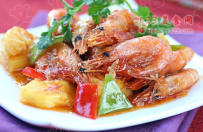 3、锅中留底油,放入姜蒜末爆香后,放入泰国鸡酱(或泰式甜辣酱),倒入调好的糖醋汁,烧开后倒入青红椒,菠萝和虾,翻炒均匀即可。