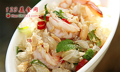 5、在大盘中放入柚子肉、虾、薄荷叶,浇上沙拉汁拌匀,最后撒上花生碎即可。