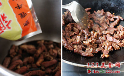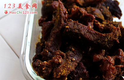 6、压好的牛肉条盛到铁锅里,用问或翻炒,汤快吃尽的时候撒入咖喱粉和芝麻。