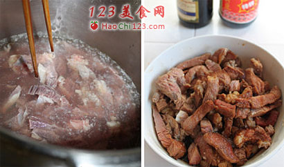3、锅里烧开水,下牛肉条焯两分钟去掉血水。
