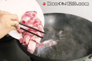 3、排骨洗净,用刀斩成5厘米的段,放入滚水中烫30秒后,捞起沥干水,倒入煮肉骨茶香料的锅里。
