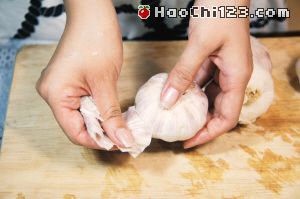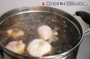 3、蒜头是做肉骨茶必不可少的主角,洗净大蒜剥掉最外层的衣,整颗放下锅熬煮就行,怕太过辛辣的话,放2~3颗蒜头为宜,放4颗蒜头煮出的肉骨茶汤,会比较辛辣,口味较重。