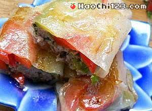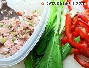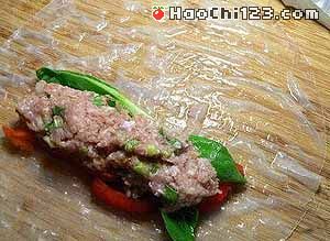 3)米纸放到装了凉水的大盘子里浸软,然后取出,放在案板上,放上红椒和油菜,顶上再摆上一排调好的肉馅儿。
