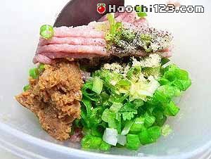 肉、米纸、葱花、大酱、姜粉、胡椒粉、鸡汤、油菜。
