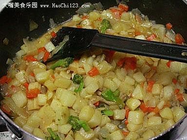 2、用厚底铝锅,置于火上,烧融黄油,然后把葱和蒜下入,炒至洋葱呈透明,把土豆丁加入搅拌几分钟。土豆丁炒到全部挂上油后,加入蔬菜汤,香叶,少许盐、胡椒面、味精、搅拌均匀。如果水少,可以再加一些,但不要太多,约微沸45分钟,要不停地搅拌,勿使其糊底。到土豆熟时(少司也变稠了)。再放些植物油和酒,混合好即可,装盘时撒上一些芹菜末。