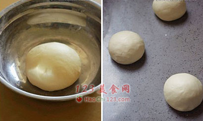 2、取出涨至2倍大的面团,排气、重新揉圆,等分成7份,滚圆后盖上保鲜膜松弛10分钟。
