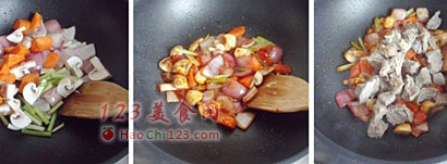4、炒到洋葱变成透明时加入胡萝卜,芹菜,蘑菇,继续炒3分钟。