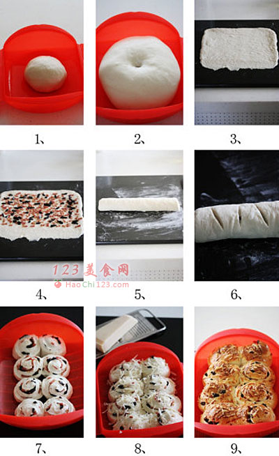 贴士:为了配合料理盒中间深两边浅的形状,所以在切面包卷的时候,先在面包卷上做出记号,分成四段,每一段的中间斜切一刀,这样切出来的面包卷就有一侧是高边,另一侧是矮边。排入料理盒的时候,将面包卷的高边的那一侧对准中线,把八个面包卷排好即可。培根配西梅,法式甜咸配,再加上表面上烤得酥香的奶酪丝,味道非常的好。