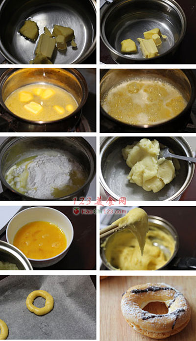 6、泡芙形成的原理很简单,是在烘烤过程中,蒸汽膨胀,并且膨胀速度很快,并在成品中间形成一个较大的洞。烤箱中的热量会使面筋和鸡蛋中的蛋白质凝结,成型,使其质地密实。泡芙中使用高筋面粉,也可以使成品质地更密实。