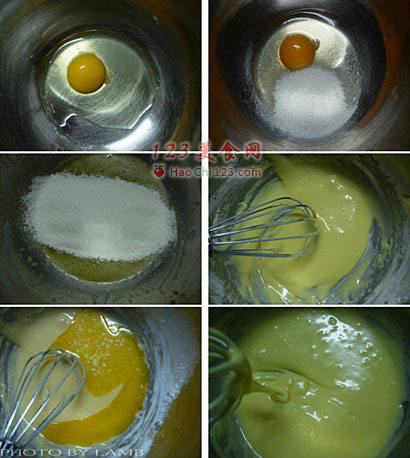 3、将低粉和泡打粉混合过筛后倒入蛋液中。搅拌均匀。