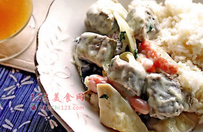2磅小牛肉(牛肩肉或牛胸肉,挑去筋膜和多余的脂肪,切小块)、5杯小牛肉汤或水、少许盐、2tbsp白葡萄酒、1根韭葱leek切段、1个胡萝卜去皮切块、半个洋葱去皮切块、6瓣大蒜、2根百里香、2根欧芹、1片月桂叶、4tbsp黄油、4tbsp面粉、1杯奶油或一半牛奶一半奶油、盐和现磨胡椒粉、1/2杯酸奶油、少许肉豆蔻粉nutmeg。