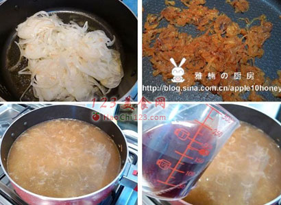 5、待黄油融化好放入洋葱丝,小火炒约30分钟,待洋葱变为焦黄色即可。