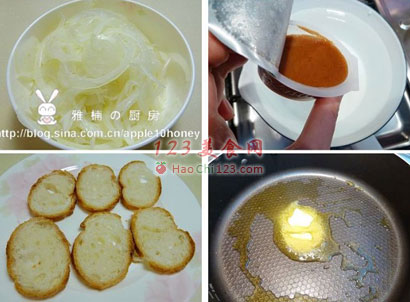 2、可以直接把放有奶酪的面包片放入汤上面一起烤,也可以将切好的法棍撒上奶酪后直接放入烤箱,待汤煮好后,直接摆放在汤中即可,这样更漂亮。