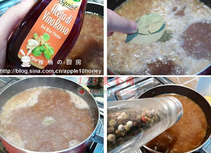 6、这时加入牛高汤、红酒,红酒醋,百里香,月桂叶大火煮开后,转小火再煮30分钟。