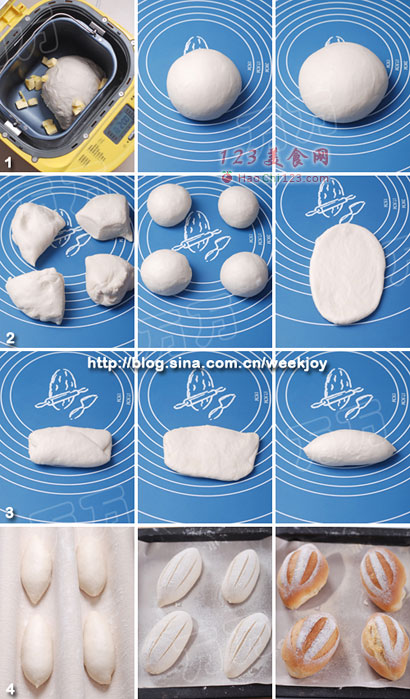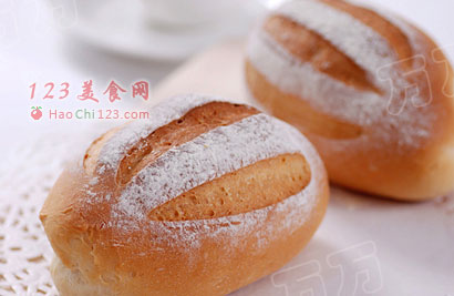 4、帆布上撒面粉,放上整形好的面团,将帆布拉近隔开,置温度28度左右,湿度80%处发酵30分钟,至体积约1.2倍大就行了。将面团排入烤盘上,筛一层面粉,用刀片割出纹路。烤箱预热200度,中下层放一烤盘,预热好后倒入少许热水以制造蒸汽,面包放中上层,烤20分钟左右即可。
