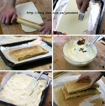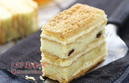 4、拿破仑酥本是一款法式甜点,但现在的中式糕点铺里却也频频出现它的踪影,而自然的,这里面出售的拿破仑酥也带上了浓浓的中式感觉——酥脆的酥皮+厚重的奶油霜+细腻的蛋糕,似乎成了拿破仑酥留在人心里最直观的印象。今天,我这篇博文里出现的,就是这么一款拿破仑酥,它由千层酥皮、奶油霜、戚风蛋糕组成。虽然,组成拿破仑酥的几样东西我们都已经很熟悉了,但要将它们漂亮地“组合”在一起,并不见得是件容易的事儿。