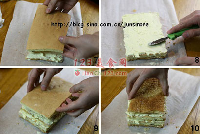6、蛋糕烤好并冷却以后,用刀裁成大小和烤好的千层酥皮一致的两片。