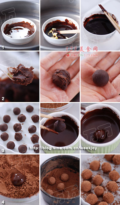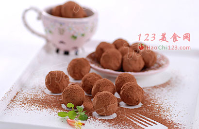 贴士:松露巧克力是一种典型的法式甜点,之所以叫做松露巧克力,千万勿以为它里面含有松露,而是因为它的外表沾有一层可可粉,形状又不规则,看上去很像沾了沙土的法国蕈类——松露。与松露一样,松露巧克力看似不起眼,吃过后才知它的妙处:软软的内芯加上脆脆的外皮,还有最外面一薄层微苦的可可粉来调剂,三重口感的美妙结合,语言无法描述。