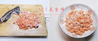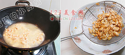 2、三文鱼过油时不要太久,鱼肉一变色就可以捞起沥油。