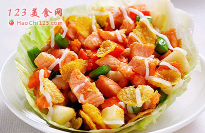 9、最后洒上玉米脆片,装在西生菜碗内即可。