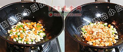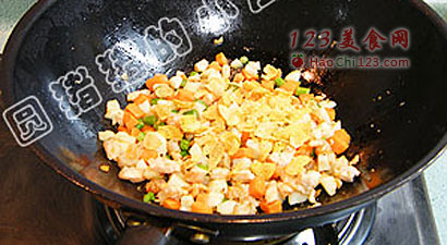6、捞起沥净油(也可用快火炒的,但不能炒碎了)。