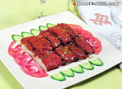 驴柳350克、青、红椒粒各5克、洋葱100克、西红柿片、黄瓜片各30克。