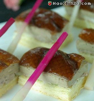 鹅肝蟹冻放入清酒,牛奶腌制24小时,制成鹅肝胚,吞拿鱼与时蔬拌匀,烤鸭取鸭胸带皮切成长方件备用,将以上原料码放在烤好的酥皮方件上即可。